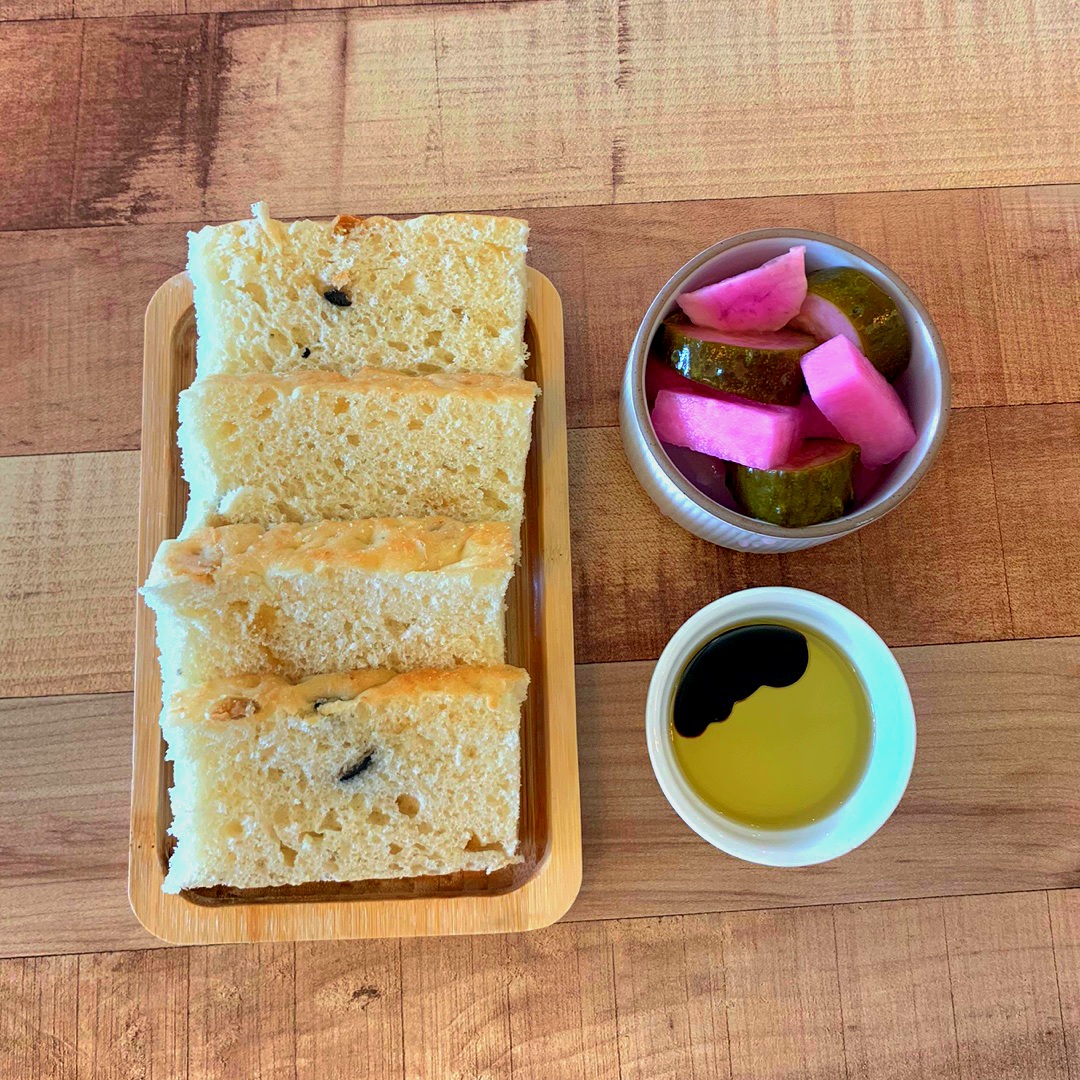 우선 기본으로 따뜻한 식전 빵과 오리브오일 발사믹 소스 그리고 피클이 먼저 서빙이 되었어요